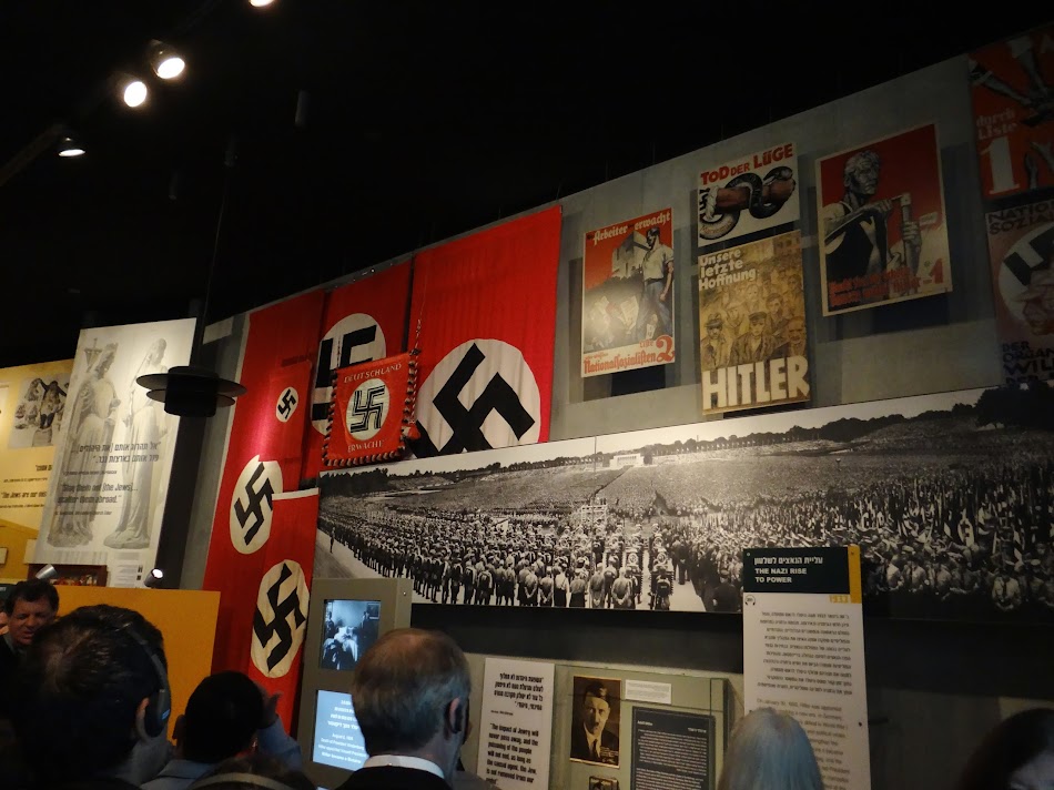 In fine, am ajuns la Muzeul Holocaustului, asaltat de numerosi soldati. Se pare ca vizita la acest muzeu este obligatorie pentru cei care satisfac stagiul militar obligatoriu (3 ani – baietii, 2 ani – fetele), dar si pentru scolarii peste 10 ani. Cert este ca erau destul de multi militari, dar, pentru ca ne cam razbise foamea, am luat masa la cantina muzeului, un loc care mi-adus aminte de cantina de la universitatea din Maastricht. In fine, cu stomacul plin, a venit o ghida provenita din SUA. Nu este un muzeu foarte mare, dar se afla intr-o gradina faina in afara Ierusalimului. Desi nu e o cladire gigantica, a fost construita avand in minte numeroase simboluri. De fapt, primii pasi ii faci intr-o zona in care apar filme despre viata evreilor, in special polonezi si germani, de dinainte de razboi – magazine, sarbatoriri traditionale, sinagogi… Apoi, incet-incet, se trece la razboi. Apar primele steaguri naziste si poze cu Hitler. Primele legi antievreiesti, pogromuri, nopti de cristal. Si apoi, intram destul de abrupt in povestea razboiului – atacul asupra Poloniei, tara care avea cel mai mare numar de evrei antebelici – circa 3,3 milioane, reprezentand cam 10% din populatie (URSS era pe locul 2 cu doar 3 milioane, reprezentand insa sub 2% din populatia Sovietelor). Romania adapostea la randul ei peste 700.000 de evrei (4,2% din populatie), cifra similara cu recensamantul din 1930, clasandu-se astfel pe locul 3 in Europa.