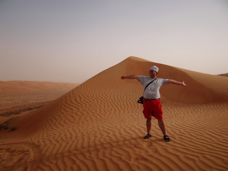 Asa ca am oprit la o vulcanizare dintr-un sat, pentru a mai dezumfla din cauciucuri (pentru o mai buna aderenta pe nisip) si ne-am avantat prin desert. Impecabilele sosele omaneze s-au transformat in impecabile drumuri de nisip prin pustiu… Ma rog, nu chiar asa de pustiu, pentru ca din directia opusa tot curgeau masini 4×4, dar, in mod imbucurator, vantul se potolise si atmosfera se curatase. Asa ca Ahmed, fara nici o avertizare, a inceput sa calareasca dunele… in spate, de la fete, se combinau tipetele de incantare cu miorlaiturile de frica… “yes, yes, go Ahmed” alaturi de “no, no, no, please”. In fine, Ahmed nu reactiona deloc, asa ca dunele se succedau una dupa alta pe sub rotile masinii. Eram pentru a treia oara cu 4×4 pe dune… si, intr-adevar, ai parte de multa adrenalina.