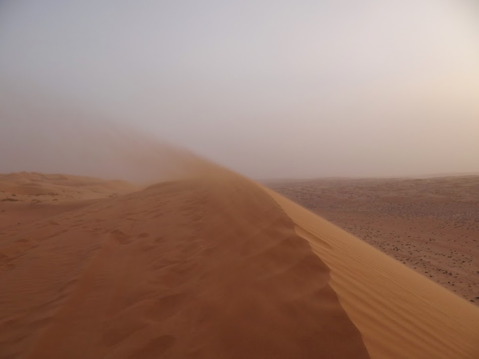 In fine, am revenit la masina, intre timp, parcarea se umpluse, parca am ajuns la timp si ne-am intors spre campie, spre soseaua principala Muscat–Sur. Daca la Wadi Bani Khalid a fost o vreme superba, soare, cer albastru, cum am ajuns la sosea, ne-a intampinat o mica surpriza neplacuta – un vant puternic care rascolea nisipul… am intrat intr-o mica furtuna de nisip. Ahmed ne spune ca vom taia din programul zilei, nu ne vom mai duce la beduini, ci vom merge direct spre Arabian Oryx Camp, tabara turistica din desert unde urma sa innoptam.. si daca vom avea un pic de noroc sa nu fie chiar o furtuna serioasa, ne vom da cu masina pe dune.