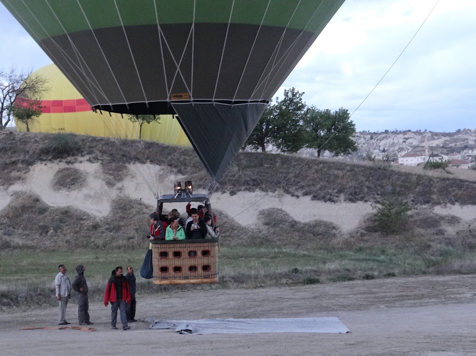 Zborul a fost incredibil de lin… am plutit cu eleganta peste oras, peste stanci, peste alte baloane, peste campie… Am tot asteptat aparitia soarelui, dar nu a fost sa fie, in schimb, ne-am bucurat de acest peisaj multicolor.. Si evident ca nimeni nu a perceput cand ora de zbor se apropia de terminare… doar cand am inceput sa ne apropiem de sol si sa vedem masinile care trageau dupa ele o platforma pozitionandu-se undeva in plin camp… Oare cum o fi aterizarea din Cappadocia? In Kenya, a fost fortata, cea din Laos a fost lina in plin camp.. . Ei bine, in Cappadocia a fost incredibila… Mr. Murat a aterizat cu nacela fix pe platforma trasa de automobil… o aterizare incredibila la punct fix a unui mare meserias… si, uitandu-ma in jur unde aterizau destule baloane, am descoperit ca toti aterizau direct pe platforma sa nu se mai chinuiasca sa urce nacela pe platforma (dezumflat, balonul este foarte mic si usor, dar nacela e grea!). Si pentru ca distractia sa fie inca mai tare, am continuat drumul trasi de automobil cu toti 20 in nacela! Din pacate, nu a durat prea mult aceasta plimbare cu nacela, ca ne-am oprit undeva in camp pentru “champagne party”.