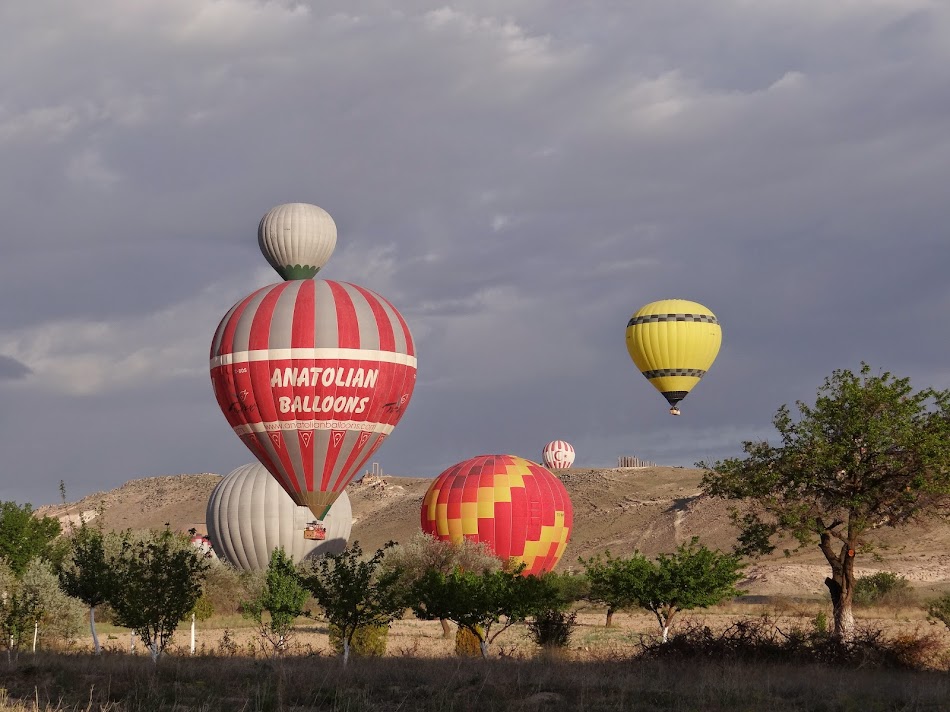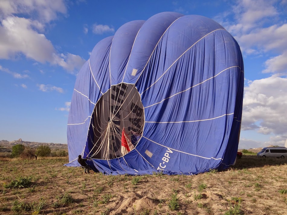 In ultima tura, incep sa realizez cat de multe baloane sunt cu adevarat in Cappadocia. Dupa fiecare colt de deal, se vedeau vreo doua baloane la umflat, de toate culorile. Pana la urma, am ajuns intr-un soi de poienita unde se umflau doua baloane verde-albastru ale celor de la Kaya Baloons https://www.kapadokyakayaballoons.com/?lang=en … de jur imprejur, plin de baloane… O atmosfera incredibila.