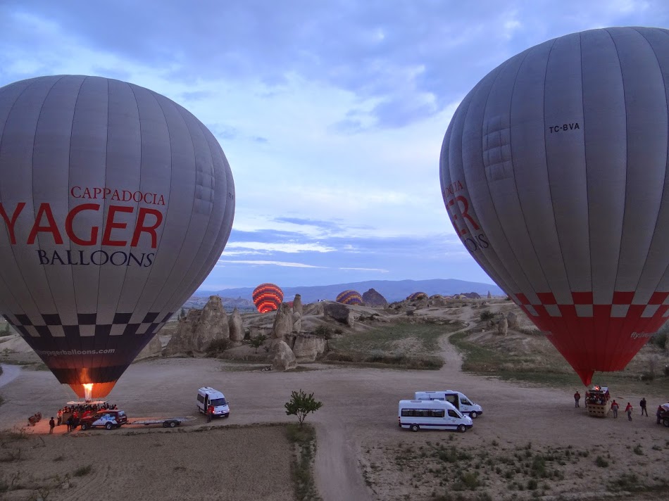 Ne-a luat un microbuz si am tulit-o spre Goreme, oraselul din care decoleaza sute de baloane in fiecare dimineata (cand nu bate vantul). Asteptam cu sufletul la gura sa vad primele baloane in curs de umflare si am vazut cateva la margine de drum. Goreme este centrul zonei cu formatiunile geologice care au facut Cappadocia faimoasa… iar dupa diverse delusoare cu forme stranii, apar primele baloane la umflat. La un moment dat, dubita noastra paraseste soseaua si ajungem intr-o zona unde se umfla vreo 6–7 baloane. Coboram pentru niste cafea, ceai si prajiturele si apoi, dupa ce suntem repartizati la balonul corect, sarim din nou in dubita sa ajungem la balonul nostru.