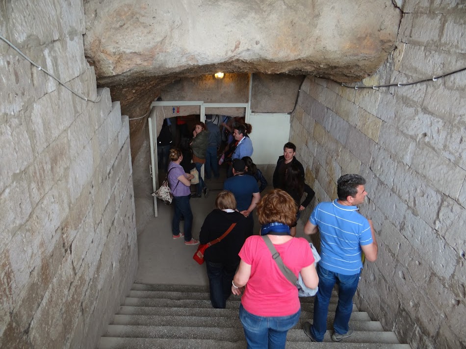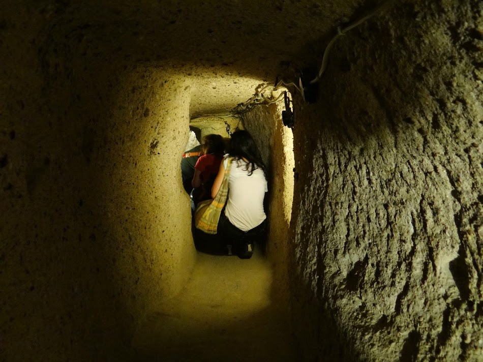 M-am uitat la ceas, asta nu era totul – mai aveam timp pana la avion, asa ca ne-am dus la al doilea oras subteran ca marime si importanta din Cappadocia – Kaymakli. Desi este mai mic decat Derinkuyu, parca aici poti patrunde in subterane mai lesne. Evident, daca ai claustrofobie, nu te vei simti tocmai bine, dar daca nu ai, parca a fost mai placut sa merg totusi destul de drept si nu sute de metri de mersul piticului! Ca si ieri, nu am coborat pana la ultimul etaj si peste tot erau tuneluri verticale de aerisire. Intrarea de la un etaj la altul era foarte abrupta, aproape verticala, asa ca ma astept ca atunci cand aceste orase subterane erau locuite, accesul sa fi fost facut cu ajutorul unei sfori… un lift avant la lettre. Evident, in imparatia subterana a Kaymakli am gasit toate atributele unui sat modern – ma rog, pentru vremea respectiva – biserica, presa de ulei, vinarie etc.