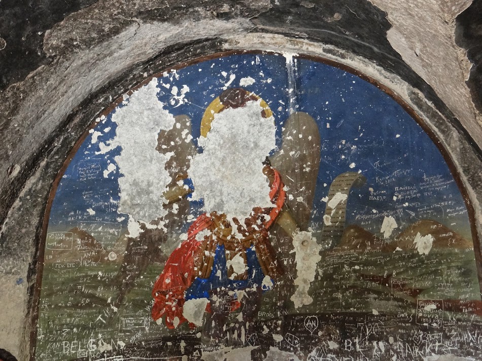 Urmatorul stop – manastirea Keslik. Am oprit autocarul undeva pe marginea unei sosele secundare si am luat-o la picior pe langa o livada inflorita. In mai, pomii sunt in floare in Cappadocia si este cu adevarat o minunatie… Dupa manastirea de la Goreme, nu ma asteptam la cine stie ce la Keslik si totusi si aici am descoperit un loc extrem de interesant. Evident, nu are amploarea manastirii de la Goreme, dar bisericile sculptate in piatra sunt intotdeauna speciale. De altfel, de multe ori mi-am adus aminte de manastirile scupltate in stanca in Etiopia… acolo a fost intr-adevar o treaba grea, aici stanca e mai moale, fiind un tuf vulcanic. Omer ne-a prezentat fascinantele fresce (din pacate, multe destul de distruse, atat de intemperiile atmosferice, cat si de mana omului) si apoi, evident, m-am cocotat deasupra bisericii, sapata literalmente intr-un delusor vulcanic. Si, sincer, a fost o mega-experienta, mai ales cand am descoperit bucataria fix pe acoperisul bisericii… Ce imaginatie pe calugarii astia!