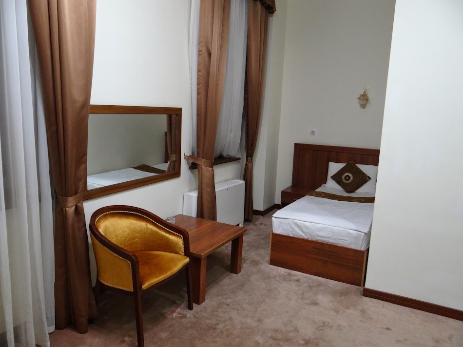 Am urcat la etaj si am intrat pe usa camerei. Nu era incuiata, asa ca nu a trebuit sa folosesc cheia din dotare. Am ramas cu gura cascata – nu primisem o camera, ci un apartament! Trei camera mari, ditamai baia, aproape oboseam sa merg dintr-un capat in altul! Si asta pentru 15 dolari in plu ! Asta mi se pare o afacere buna. Noroc ca nu am desfacut bagajele, trebuia sa cobor sa dau un skype (hotelul avea internet doar in lobby, nu si in camera). Si cand sa inchid usa, fatalitate, cheia nu mergea. Ridic capul si descopar ca nu era camera mea… Camerele goale erau lasate deschise vraiste si eu intrasem, din greseala, in suite :). Asa ca mi-am mutat calabalacul in camera mea. O camera standard, dar si ea mare rau… ma rog, patul era pus cam aiurea intr-o nisa fix sub geam (taman bine sa te trezesti la 5 dimineata cand rasare soarele si, credeti-ma, soarele bate tare in Uzbekistan).