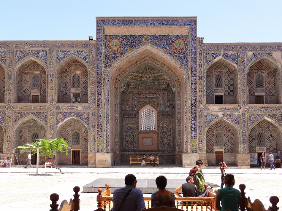 Uitandu-te la poze, ai avea senzatia ca aici se intalnesc trei moschei. Ei bine, nu sunt moschei, cele trei cladiri au fost de fapt medrese, universitati celebre in toata lumea islamica, unde timurizii au adus cei mai buni profesori (cu japca sau nu). O luam gospodareste. Mai intai medresa din dreapta (Sher Dor – a Leului). Este faimoasa datorita imaginilor nu prea islamice de pe fatada … apare figura unor tigri (ma rog, ar fi trebuit sa fie lei, dar n-a iesit) si un soare… sunt simboluri zoroastriene care cum necum au devenit si simboluri Shiite. Populatia din zona a fost in general sunita, dar regele care a construit avea niste aplecari spre shiism… si a vrut s-o spuna sus si tare. Urmatoarea medresa, cea din fund i se spune Tilla-Kari (sau “acoperita in aur”) unde interiorul partii sfinte, moscheea a fost placata in aur. Nu stiu cat aur mai e acuma, dar in mod cert, interiorul straluceste precum mult prea doritul material. Dar cea mai interesanta parte a moscheeii mi s-a parut mica expozitie de poze din perioada pre-sovietica a Samarkandului – cu medresele partial cazute, cu fatadele stricate si cu un bazar imens care se intindea din medresa in medresa.