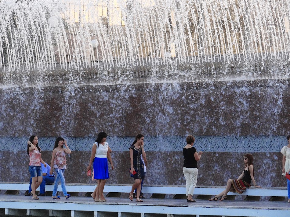 Dar, de departe, cel mai fain colt din aceasta colosala piata este o fantana, unde ai senzatia ca poti trece prin apa. Absolut geniala! Si am urmat si eu exemplul a numerosi uzbeci si mi-am bagat labutele in apa… calda rau, se vede ca in fiecare zi sunt aproape 40 de grade!