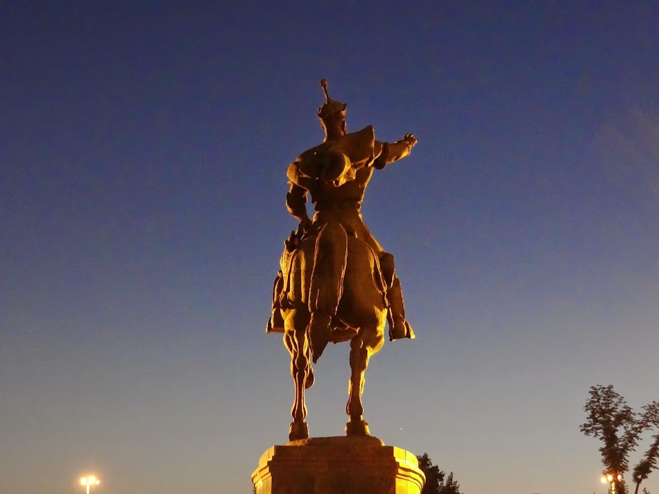 Finalul zilei ne-a prins in fata statuii lui Timur Lenk (cine altul?) din fata hotelului Uzbekistan (o cladire sovietica aducand cu hotelul Cosmos din Moscova). Pe locul vechii statui a lui Karl Marx (un tip care avea mult de-a face cu istoria Uzbekistanului) a fost ridicata versiunea pasnica a lui Timur… calare, dar nu cu sabia in mana (cum ar fi fost normal), ci fara nimic, ca un semn de pace si liniste…. Hm, totusi baiatul asta a omorat 17 milioane de oameni…