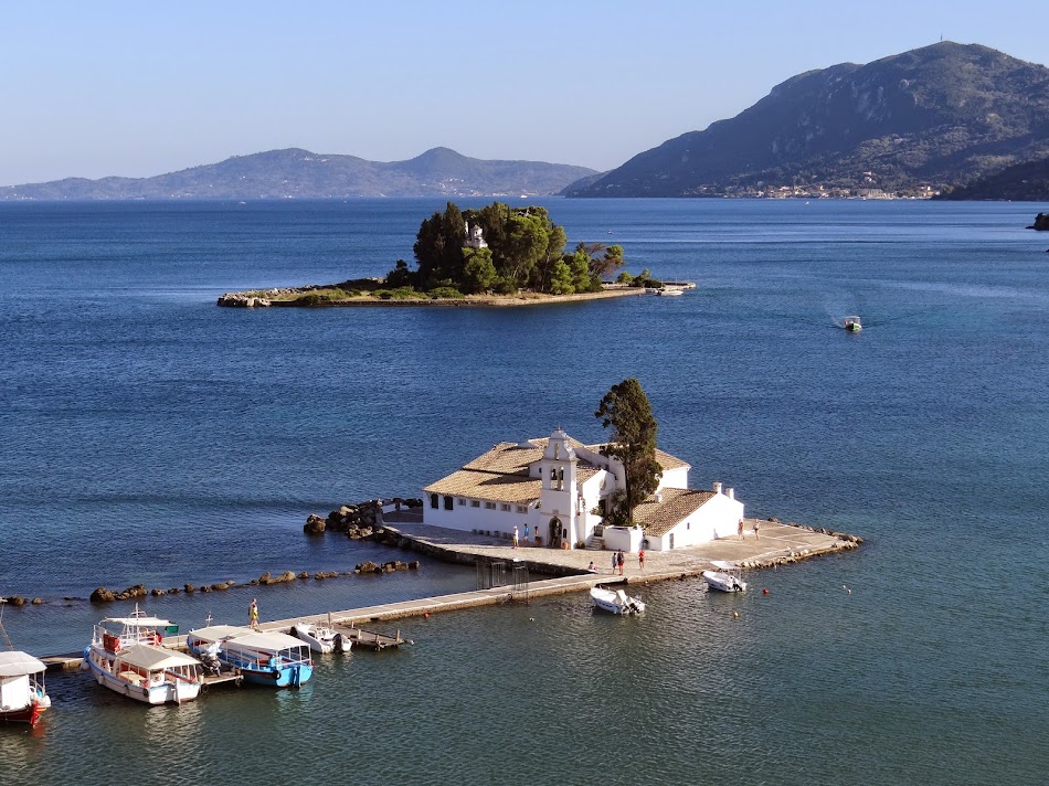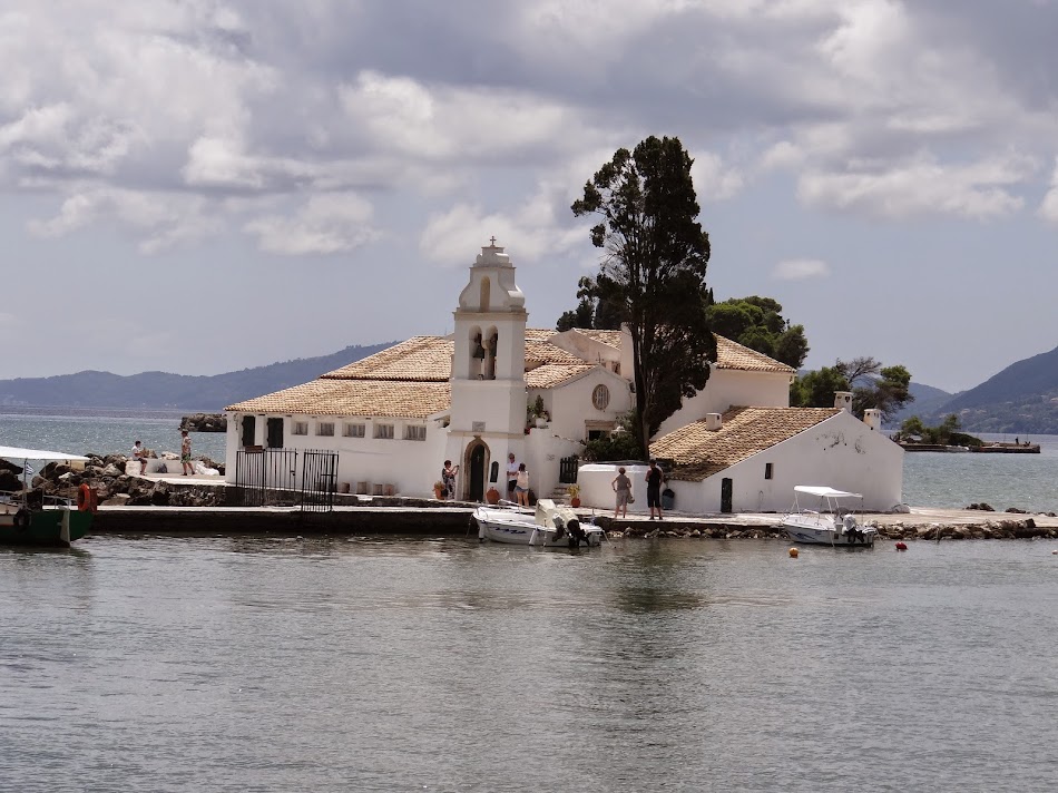 Autobuzul m-a purtat prin tot soiul de stradute ale noului Corfu City, apoi a trecut prin fata intrarii Mon Repos si a unor ruine pe langa care am trecut si in prima zi, cand toti clientii Prestige Tours erau “livrati” la hotelul lor (exista cateva hoteluri si prin Kanoni, cu o panorama splendida spre pista de decolare a aeroportului Capodistria) si la un moment dat, dupa ce am vazut niste indicatoare, m-am dat jos de teama ca autobuzul nu se duce unde imi doream eu. Ma rog, o temere gresita, dar nu conteaza, am mai mers pe jos vreo 10–15 minute si am ajuns in fata augustei imagini… doua insule parca plutind pe un covor albastru, ducand in spate cate o biserica. Fain.