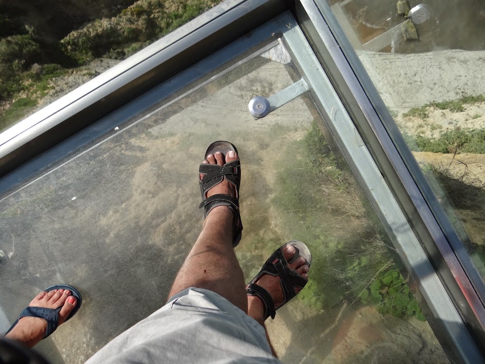 Calatorului ii sta bine cu drumul asa ca, dupa ce intorc cu chiu, cu vai masina, revin in satul Peroulades. Revad semnul cu Sunset Beach. Hai, bre, sa vad si ce e pe acolo… semnul spune ca e la vreo 800 de metri. Spre deosebire de plaja secreta, aici dau de ditamai parcarea si de niste terase. Hm… Fac insa doar cativa pasi si raman cu gura cascata. Wow! Asta e de departe cea mai spectaculoasa plaja din Corfu. Extraordinara… un canion de vreo 100–200 de metri se prabuseste abrupt in mare. Iar dedesupt, o plaja foarte ingusta. Inteleg ca ar fi cazut niste bolovani acum ceva timp, dar asta e… am venit sa admir, nu sa stau la plaja. Si am ce admira, este un loc fantastic… Si, cu toate ca ma gandeam ca voi sta cateva minute, minutele se transforma in zeci de minute. Descopar un balconas cu podeaua de sticla (foarte la moda prin China), apoi cobor la malul marii… Este fabulos, fabulos, fabulos.
