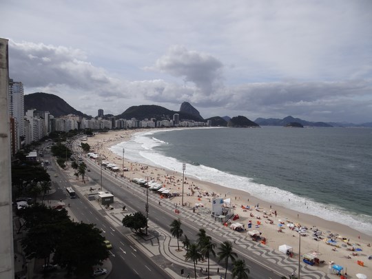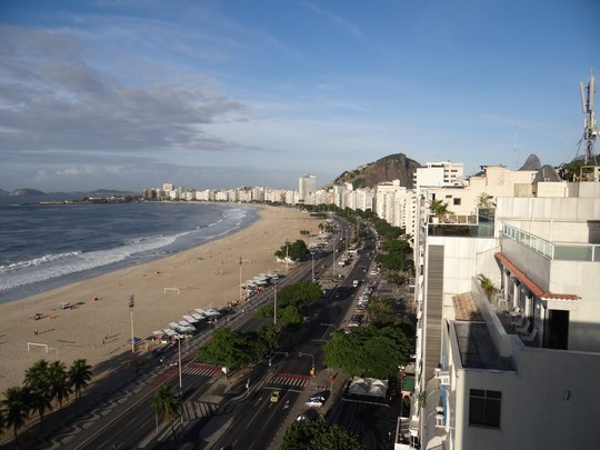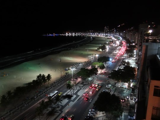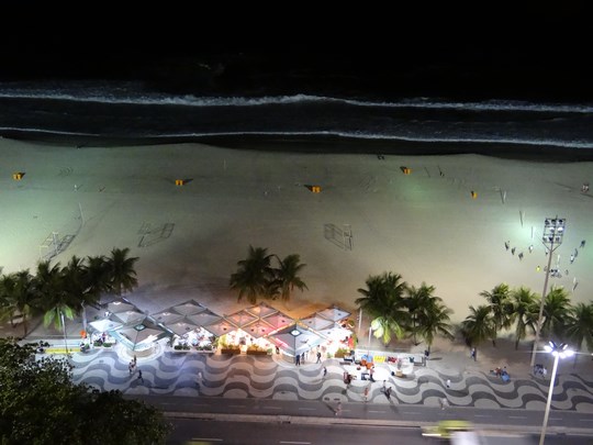 Cum scriam si la inceputul acestui serial, nu ajunsesem in Brazilia si din cauza problemelor de siguranta personala. Brazilia este departe de a fi cel mai safe loc de pe Pamant, iar Rio este in topul infractionalitatii. As minti daca as sustine ca nu am ajuns la Rio cu ochii in patru si cu un pic de paranoia in neuronul prevederii. Cand am ajuns in hotel, primul lucru a fost sa-mi umplu safe-ul cu orice aveam mai de valoare. Ghidurile spuneau sa ne lasam lantisoarele, inelele, sculele cat de cat electronice si sa purcedem prin oras cu cativa bani de cheltuiala. Pentru nimic in lume sa nu te duci pe plaja dupa caderea noptii. Norocul a facut ca sa stau in hotelul Windsor Plaza Hotel, fix pe Copacabana. Adica, de cealalta parte a bulevardului Atlantico, iconicul bulevard care trece pe langa legendara plaja. Dupa ce mi-am baricadat orice parea sa aiba o oarecare valoare, am luat liftul sa arunc o privire de sus de pe cladire. Spatiul la bulevardul Atlantico costa tare-tare mult, asa ca majoritatea blocurilor-hotel de aici nu au decat un numar infim de camere cu ferestrele la plaja. Camera mea avea privire partiala – adica, trebuia sa ma chiorasc bine sa vad un picut de ocean… in schimb sus pe cladire, aveai parte de o panorama unica – intreaga Copacabana de la stanga la dreapta, dar si celebra statuie a lui Isus. Dumnezeule, cel care i-a dat numele de Cidade Maravilhosa nu s-a inselat niciun pic! E drept, e noapte, dar plaja e luminata si, daca ma uit bine, langa trotuar, la fiecare 1 – 200 metri se afla o terasa. E musai sa coboram degraba! Cu toate riscurile.