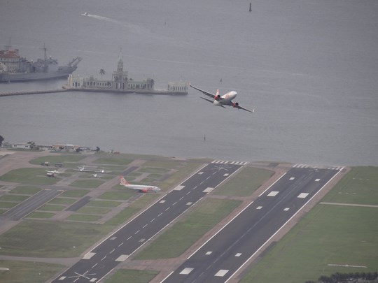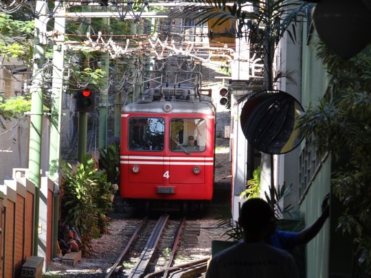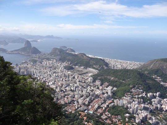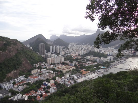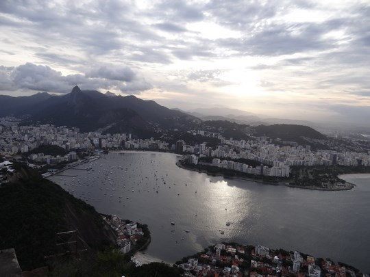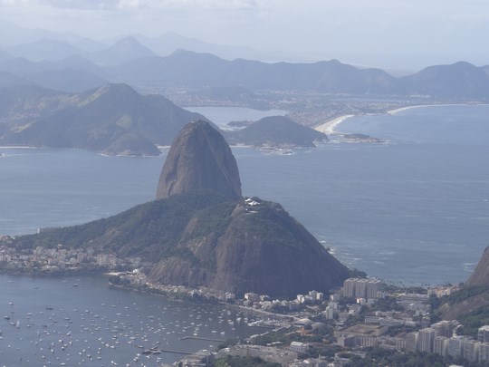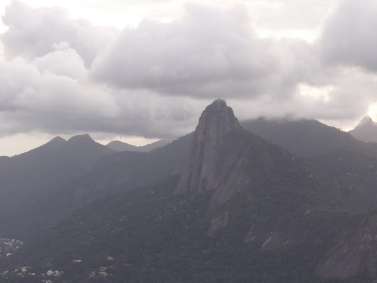 Ajungand sus, in varful lui Pao, pot sa imi trag sufletul si sa ma uit primprejur… de jur-imprejur, apa, mare, ocean. Remarc cu ochiul unui plane spotter si micul aeroport Santos-Dumont, construit practic pe o insula in mijlocul apei… orice pilot care decoleaza trebuie sa traga zdravan de mansa pentru a se ridica inainte de a face cunostinta cu apa destul de rece a Atlanticului… si apoi sa faca o curba stransa stanga pentru a nu se lovi de Pao de Acucar! Si sunt decolari dupa decolari, un adevarat spectacol pentru un pasionat de aviatie… In stanga, orasul cu blocurile sale inalte si zvelte, rasarind dintre stancile pline de vegetatie ale orasului… In fata lui Pao, se afla fix statuia lui Isus (cel mai bine pentru poze este insa sa vii dimineata, nu dupa-amiaza, ca noi), dar care, surprinzator, ne ofera un mic spectacol – s-a ascuns in nori! Daca, dimineata, cand am fost la Isus, cerul era degajat, curat, cu putini nori, dupa pranz vremea s-a schimbat si norii au cucerit orasul… iar Isus s-a ascuns acolo, intre ei… Doar pentru putin timp, insa. Panorama e geniala. Se vad muntii in departare, muntii unde se afla Petropolisul imperial, doar Copacabana se ascunde in spatele unui alt deal-bolovan. Un loc in care sa petreci cateva ore cu un mojito in fata. Dar nu avem noi luxul asta.