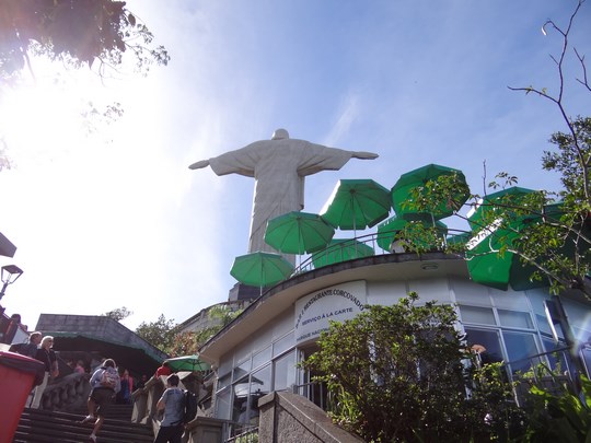 In fine, ajungem sus, dar mai e un hop de trecut. Ne punem linistiti la o coada lunga-lunga la un lift care urmeaza sa ne urce la urmatorul etaj, langa imensa statuie. Intreb daca pot sa ajung si pe jos. Fara indoiala! Asa ca o iau la fuga pe scari spre imensul monument care ma trateaza, pana una-alta, cu spatele. Dar ce conteaza, panorama orasului minunat este incredibila.
