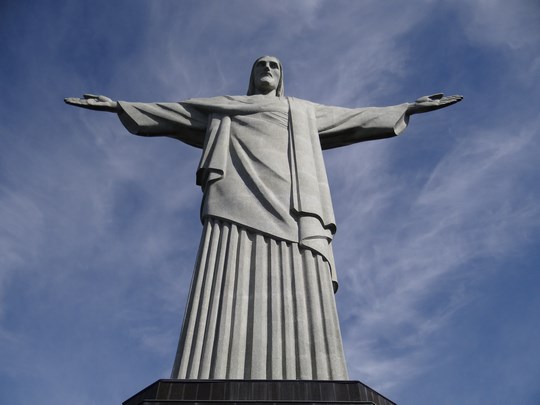 Ajung, in fine, in fata statuii. Ma uit cu atentie la fata lui Isus. Nu pentru ca ar fi o capodopera unica (nu e rea, orisicum), dar pentru ca a fost facuta si de un roman, Gheorghe Leonida, care a fost cooptat in echipa francezului Paul Landowski, sculptorul oficial al monumentului. Construirea monumentului a durat noua ani, acesta fiind inaugurat in 1931. Costul total (se pare, finantat din donatiile catolicilor brazilieni) a fost de 250.000 de dolari americani (echivalentul a 3,3 milioane de dolari din ziua de azi – ca si dolarul asta s-a devalorizat rau de tot). Din pacate, nu este exact locul pentru meditatie… esplanada din fata statuii colcaie de turisti, unii tavaliti pe jos incercand sa isi pozeze prietenii cu mainile obligatoriu intinse. Ma indepartez cat pot de mult, pana la buza prapastiei, pentru a admira monumentul, dar si incredibila panorama. Acum, judecand la rece (dar si atunci, judecand la cald), nu pot spune ca statuia lui Isus merita sa se afle pe lista celor 7 minuni ale lumii (Angkor Wat sau statuile de pe Insula Pastelui mi se par mult mai “minunate”), dar in mod cert locul acesta se afla pe lista celor 7 panorame minunate ale lumii. E greu de descris panorama, muntii din mijlocul carora rasar cladiri, oceanul care isi traseaza granita printr-o plaja de un alb stralucitor. Greu de desprins de aici. Evident, fac poza de rigoare cu bratele larg deschise si plec… Asta e un loc in care sa vii sa stai… si poate dupa-amiaza, cand soarele bate din spatele statuii, luminand orasul.