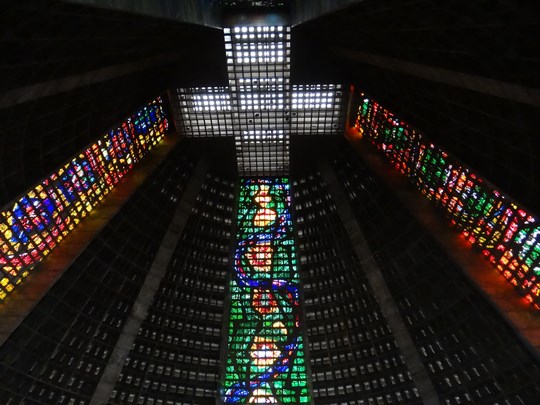 Dupa ce coboram la poalele dealului, vom face un scurt tur de oras, mai mult in autocar decat pe jos. Trecem prin centrul istoric, unde cladiri monumentale in stil frantuzesc imi amintesc de Batranul Continent si coboram, cinci minute, pentru a vedea Sambodromul… Sincer, nimic deosebit, doar niste tribune parasite (culmea, in tribune se afla si o scoala), asta e un loc care merita vazut doar de Carnaval. In schimb, raman cu gura cascata pana la urechi cand intram in modernista catedrala Rio de Janeiro. Se vede ca a fost construita in anii ’70, e o cladire SF pentru anii aceia, o piramida care nu iti spune nimic ca ar fi un lacas de cult catolic, dar care inauntru este o combinatie de simboluri crestine si o naveta spatiala din primele parti ale „Razboiului stelelor”. Se zice ca inspiratia nu provine de la anticii egipteni, ci, mai degraba, de la mai apropiatii mayasi si piramidele lor, in varful carora preotii smulgeau inima inca batand din piepturile prizonierilor de razboi. Asta e cu adevarat o cladire care m-a lasat cu gura cascata… mai degraba aceasta este o minune a lumii.