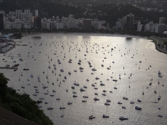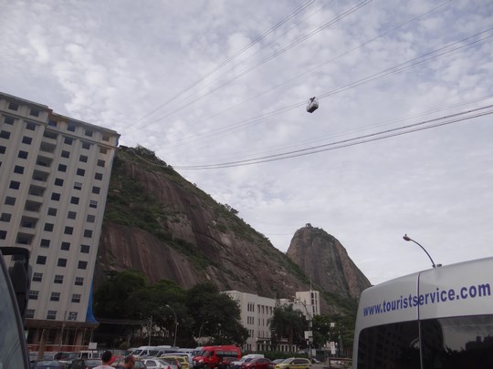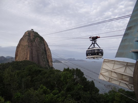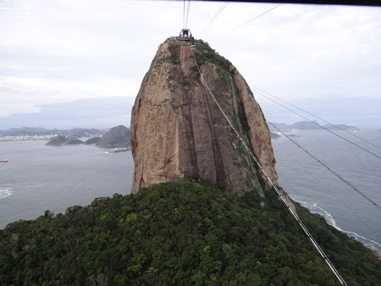 Urmeaza obligatoriul pranz (nu mi-e foame, dar n-am ce face) intr-un hotel de pe Copacabana (cel putin, panorama de pe acoperis, acolo unde se afla si piscina, este pur si simplu superba) si vom termina ziua de vizitare pe celalalt simbol al orasului – dealul cu forma ciudata care poarta numele romantic de Pao de Acucar – Painea de zahar. Este practic o peninsula in varful careia a rasarit acest deal ca o paine, intrand adanc in Oceanul Atlantic. Daca la Isus mai ai posibilitatea sa ajungi cumva si cu masina, aici nu poti sa urci decat cu telecabina – dealul este foarte abrupt, practic, o stanca, o piatra imensa aruncata in picioare de vreun zeu pagan si pus pe sotii. Ne punem in telecabina (sunt doua statii) si survolam Rio…. Orice punct de panorama din Rio este cu adevarat un vis.